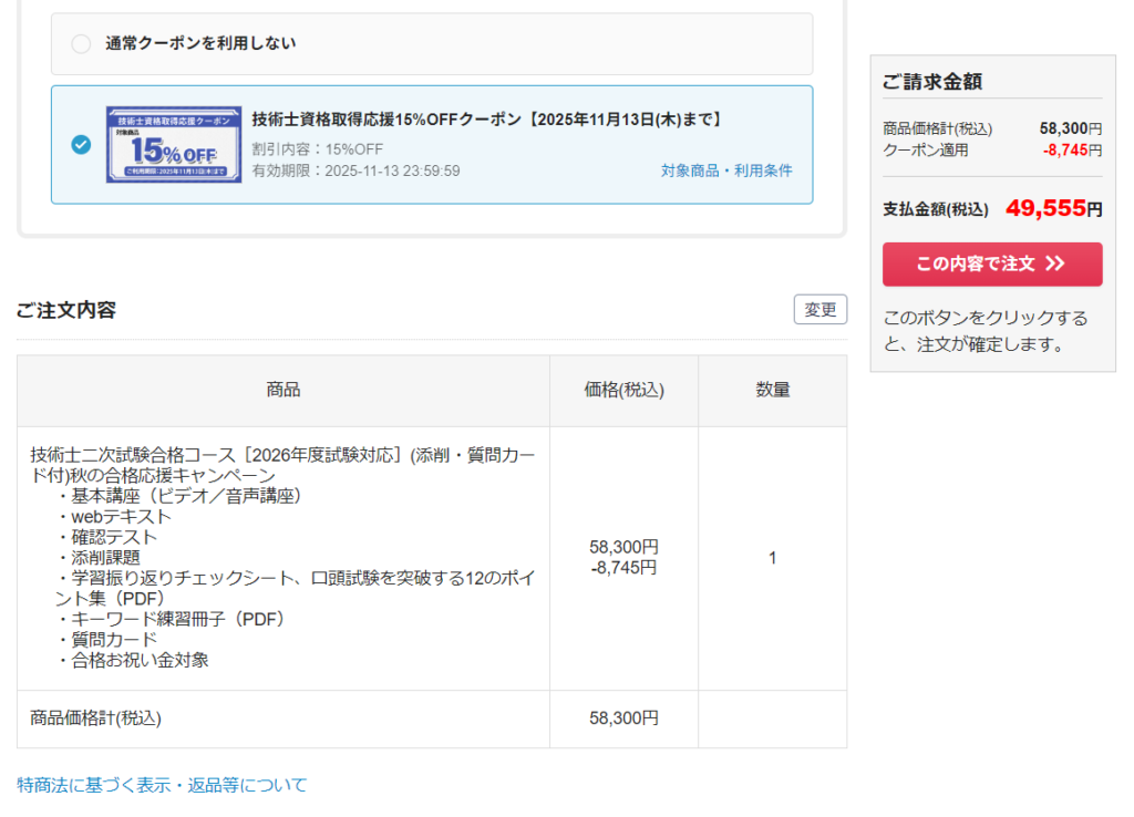 技術士講座の受講料は10万円を超えるのが普通ですから、この価格でこの内容は非常にコスパが高いです。